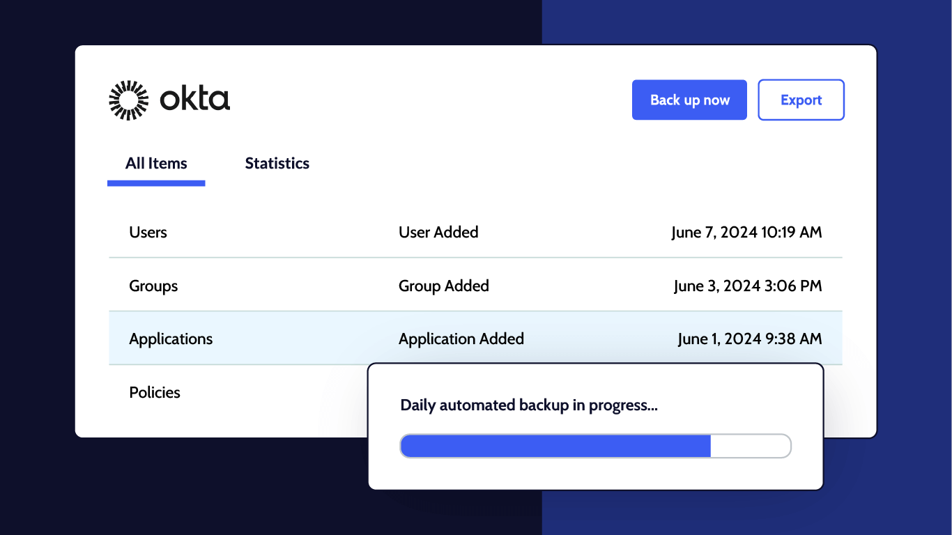 Cloud-based app for Okta that provides automated daily and on-demand backups, granular recovery, 365-day backup history, and enterprise-grade security.