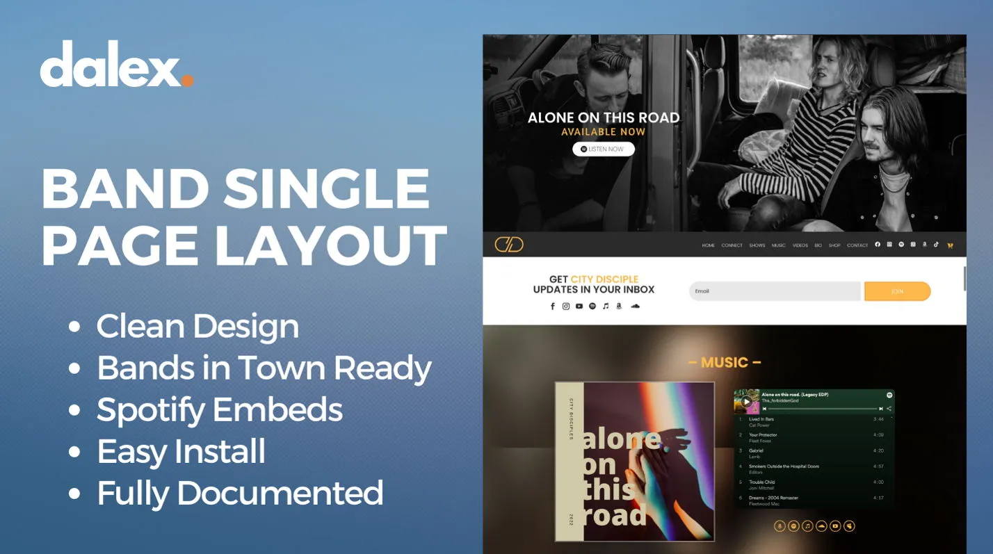 Single-page Divi layout for bands and musicians with sections for bio, music, events, and contact—fully responsive and customizable.