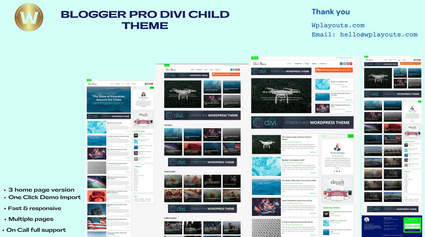Blogger Pro Divi Child theme – is a modern and elegant Multi Page Divi Child Theme that is suitable for Web stories, Newspapers, Authors, magazines, Multi newspapers, News magazines, news, photography news, Food Blogging, publisher magazines, Personal blog, and Travel blog categories.