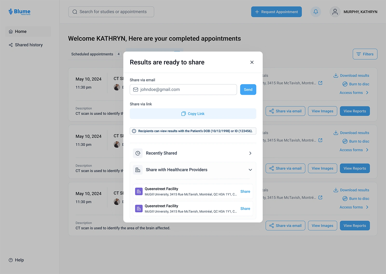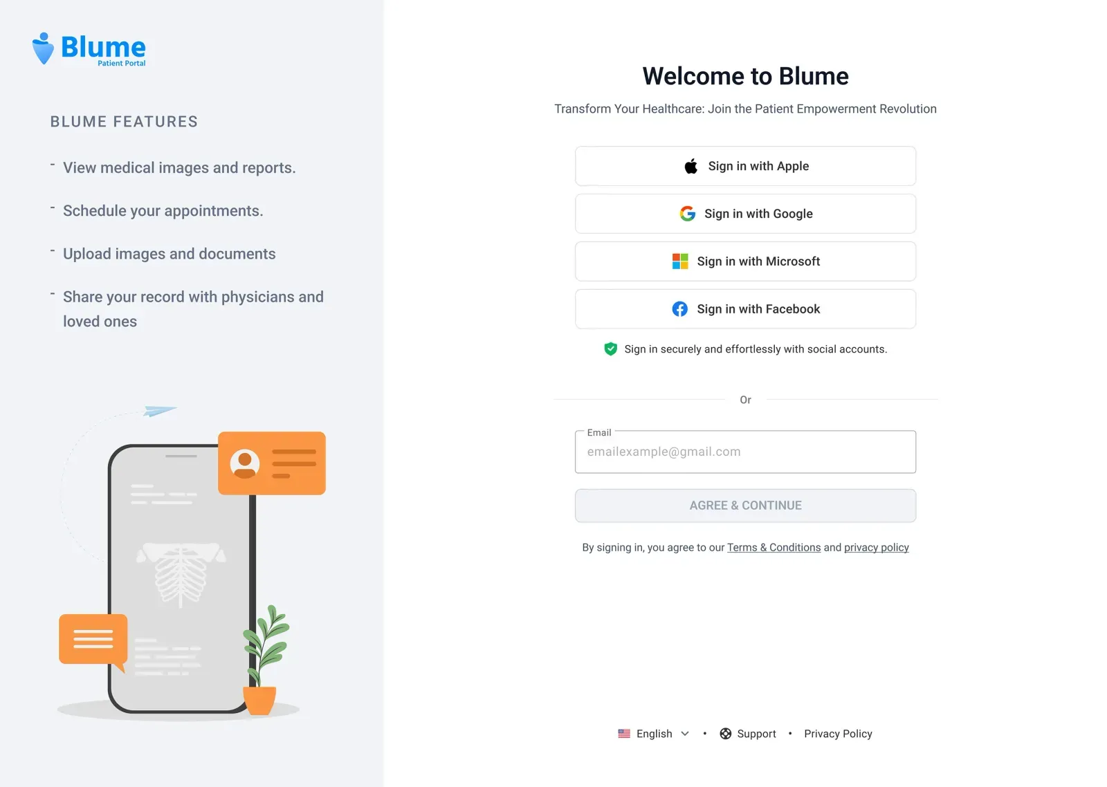 - **Intuitive user experience: **Patients can easily use Blume to create and manage their profiles, update their information, view their complete medical records, and share medical images and files.