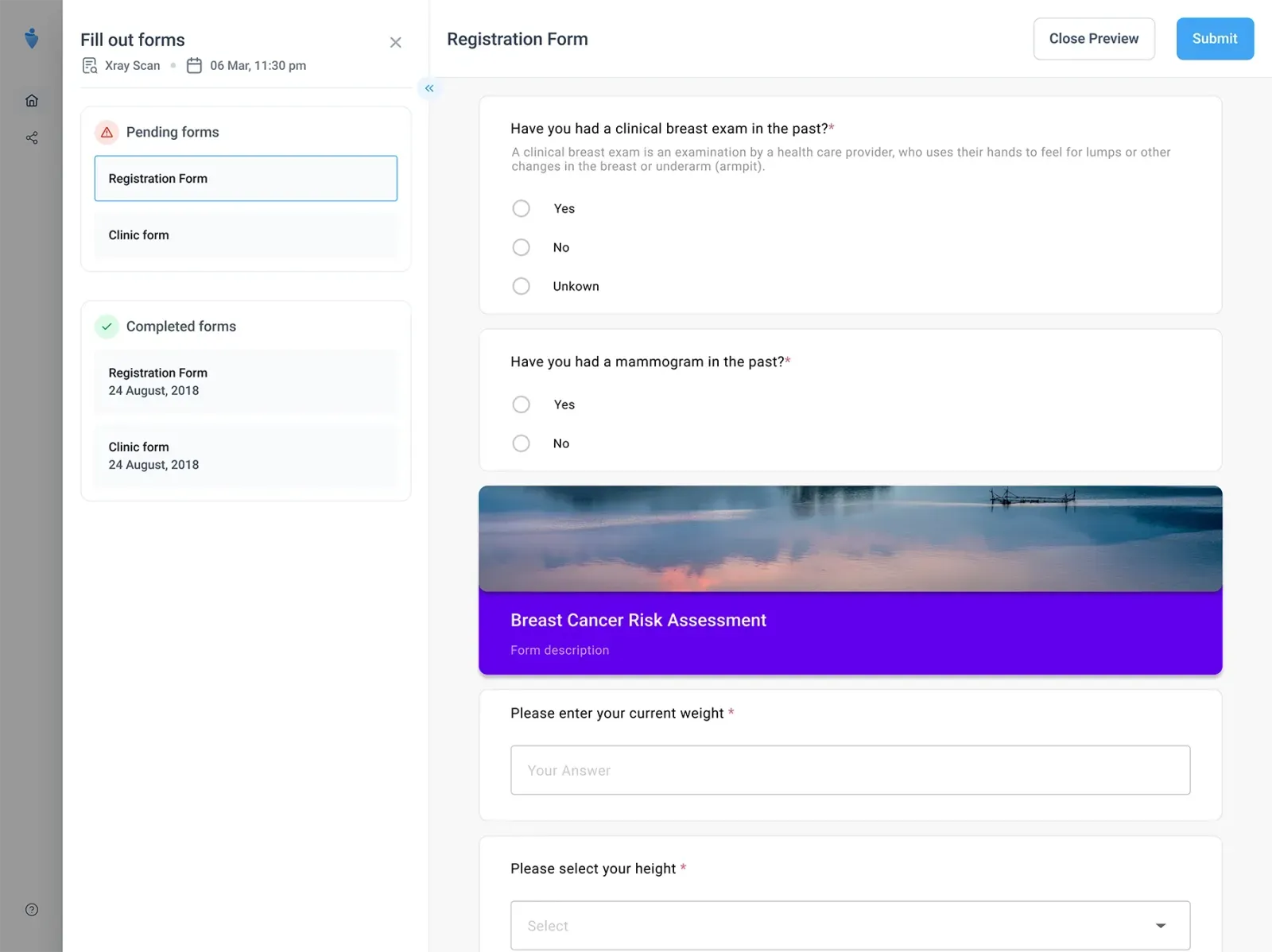 - **Enhance patient engagement while improving operational efficiency and reducing costs. **Shorten the registration process for patients by filling out forms anytime, anywhere – before arriving or after scheduling an appointment. New patients receive reminders to fill out intake forms, while existing patients are prompted if forms have not been completed. Patient forms are tailored for specific modalities, procedures, or workflows, capturing the right information. Registration or clinical forms are uploaded as an editable PDF or newly designed, customized for every organization.