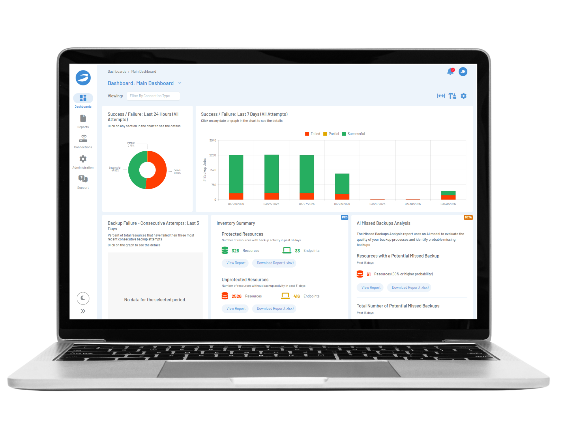 - **SLA and Compliance Reporting: **Leverage dozens of configurable standard reports, including an AI-powered Missed Backup report, to ensure data is protected.