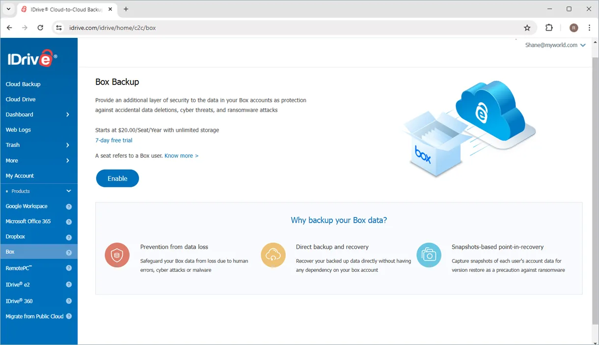 Your Box drive is the storehouse for unstructured data - presentations, sheets, documents, contracts, spec sheets, images, videos - that is crucial to the functioning of your business. A simple human error, or a sophisticated ransomware attack can cause unmitigated data loss. Hence using a third-party backup to protect your business-critical data is essential. IDrive provides 3X daily automated backups, intuitive snapshot schedules, granular and self-service recovery for your Box Drive data.