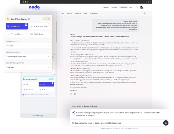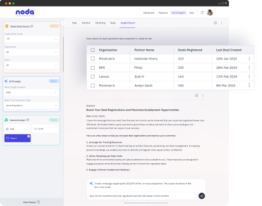 Vendors and partners can drive business outcomes with AI-powered insights & reporting. Case in point, vendors can quickly generate a report on top partners with their deals or revenue data with a simple prompt or a few criteria.