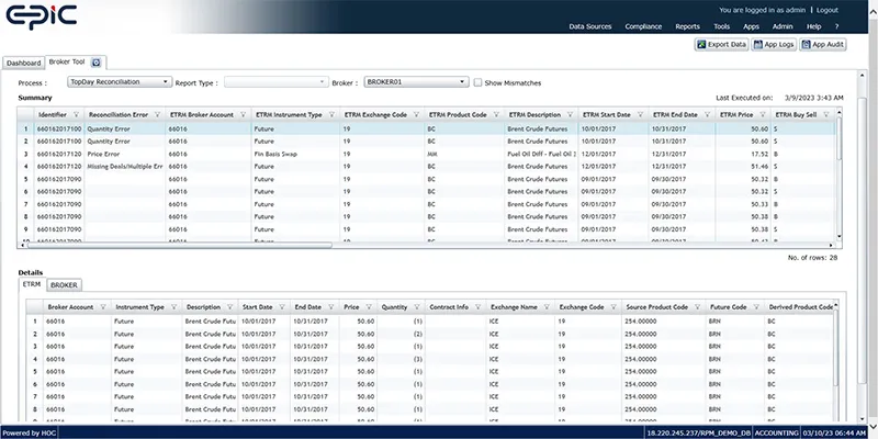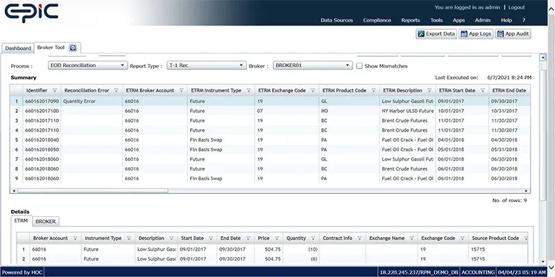 The Broker Reconciliation App allows users to run intraday trade reconciliations to ensure there are no errors in trade entries.