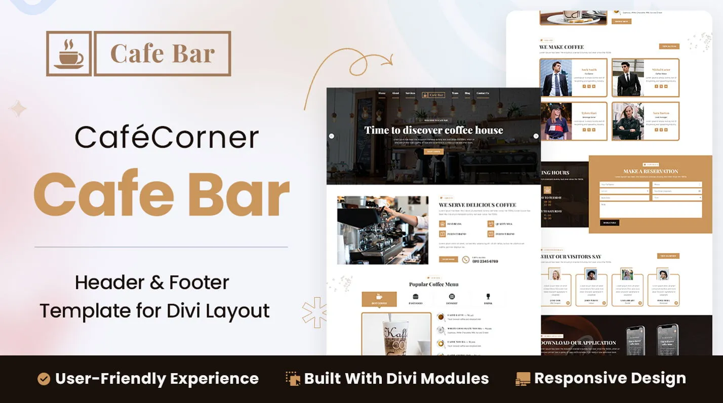 CaféCorner is a premium Divi Layout with a clean and modern design for coffee roasters, cafés, and bakeries. It is suitable for all kinds of food businesses, such as restaurants, sports pubs, coffee bars, coffee houses, diners, drinks, pastry shops, reservations, cafe bars, burger places, eateries, lunchrooms, fast-food establishments, grills, pizzerias, beer gardens, cocktail lounges, drinkers, cybercafes, bistros, coffee shops, cafeterias, craft coffee shops, coffee brewing establishments, bars, tea shops, bakeries, and similar businesses.