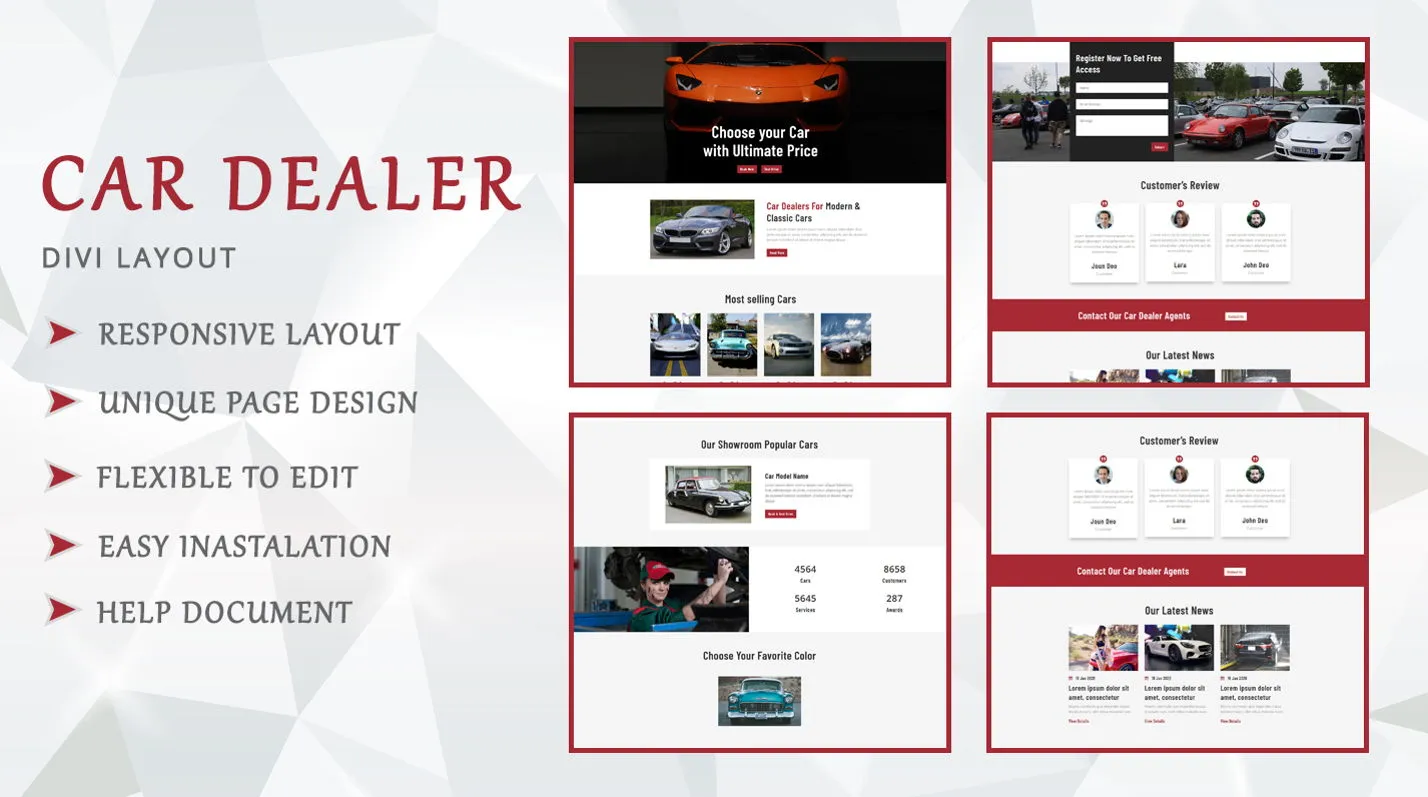 Car Dealer is simple and flexible Divi Layout page. This layout is suitable for car dealer, car seller, car show room, car exports, car rental service, car sales, car sale, used car sale and general categories.