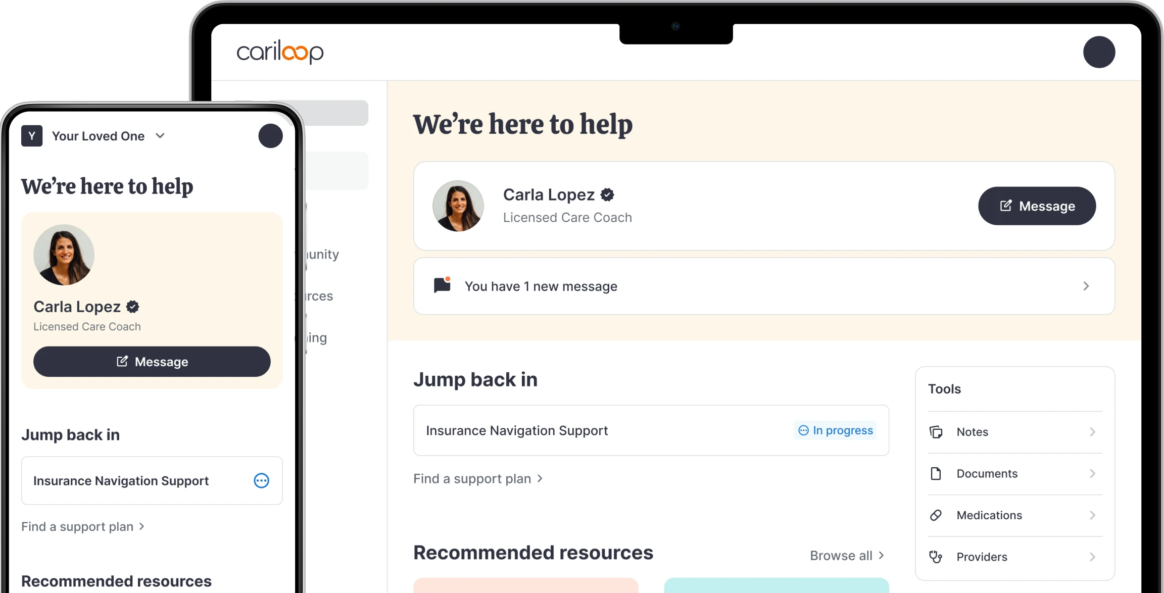 Cloud-based caregiver support platform pairing families with licensed Care Coaches, digital tools, and care provider networks for all caregiving needs.