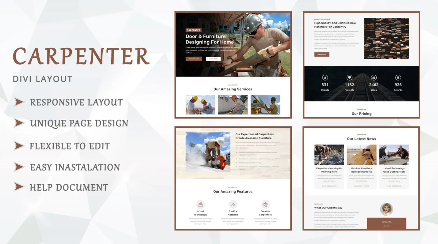 Stylish Divi layout pack for carpentry and construction businesses with high-quality visuals and easy customization.