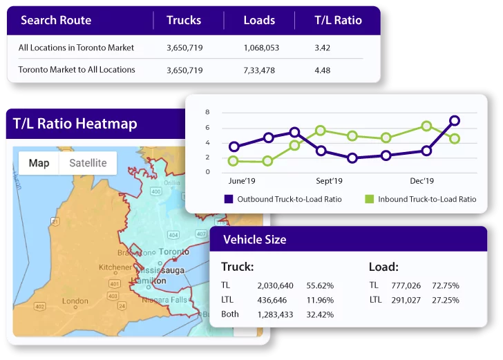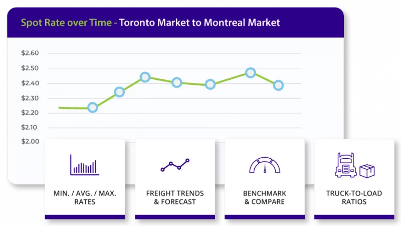 - **Complete Coverage: **Access to spot rates and capacity data across thousands of lanes in Canada and cross-border markets, including van, reefer, flatbed and more.