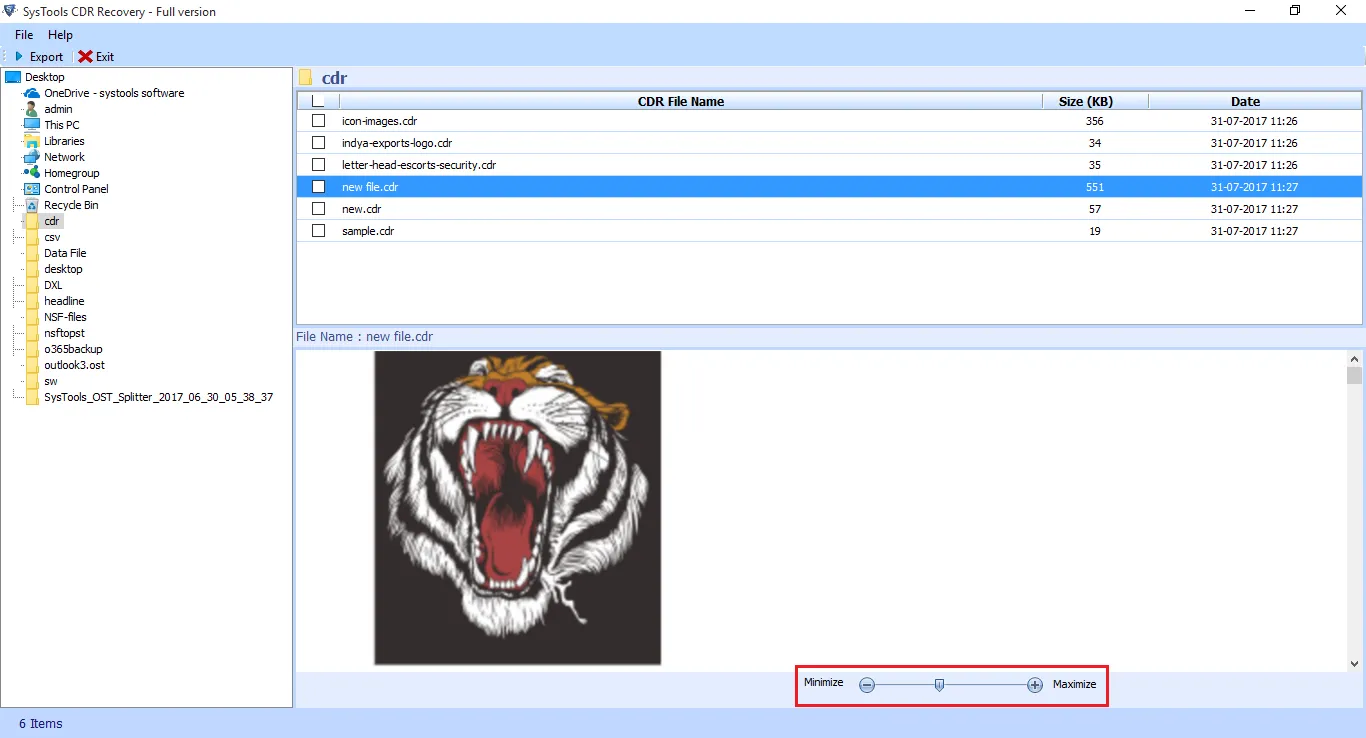 SysTools CDR Recovery Software is designed to repair corrupted or damaged CorelDraw (CDR) files, ensuring minimal data loss during the recovery process. It allows users to load and scan complete data from CDR files, supporting the recovery of multiple files simultaneously. The software provides a user-friendly interface, enabling users to minimize and maximize images within the interface for detailed previewing before exporting. There are no file size limitations during the CDR recovery process, making it suitable for a wide range of file sizes. The tool is compatible with CorelDRAW versions x8, x7, x6, and x5, as well as later versions, and supports all Windows OS versions, including Windows 11. The software scans corrupted CDR files and generates a preview of the complete data, allowing users to view each file with precision, including its size and date. It facilitates bulk repair of CDR files, enabling users to recover corrupted, damaged, and deleted files while maintaining the original structure. After recovery, the tool provides an option to export the data back into CDR format, ensuring data integrity. A sliding bar is included to adjust the image size while previewing the file, allowing for detailed inspection before exporting.