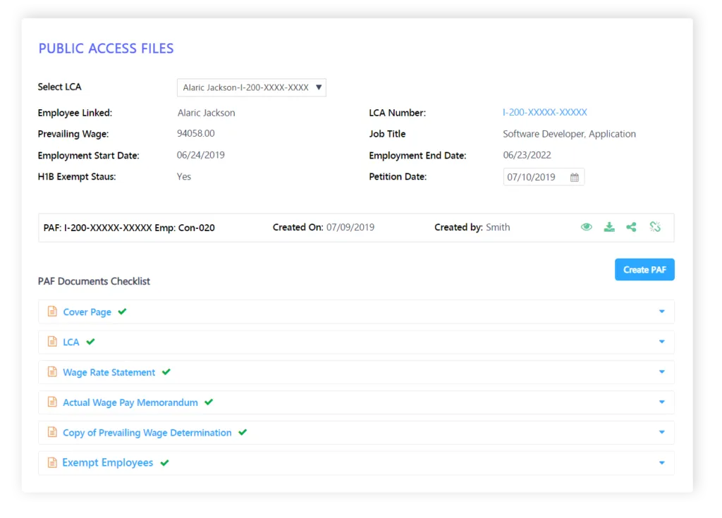 Streamline document management and maintain public access files with Ceipal. Team members can ensure all data is properly documented by instantly creating PAFs from employees’ LCAs. These PAFs can be created with dynamic templates and customizable checklists based on your client’s requirements. All PAFs can be immediately shared with completion requests and due dates through the system.