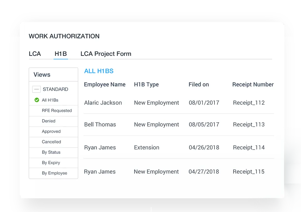 Oversee employee LCAs and ensure all documents are properly utilized and up-to-date. Team members can import LCAs and H-1B documents into the system, viewing all documents and setting automatic reminders for expiration dates. Plus, members can track LCA usage and see which are tied to H-1Bs.