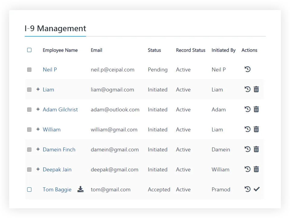 From start to finish, manage the I-9 process from one page. With Ceipal, back office employees can send pre-populated I-9 forms directly to both new hires and authorized representatives without leaving the system. Employees and authorized representatives can then resubmit completed paperwork directly to the system, for clean and simple documentation.
