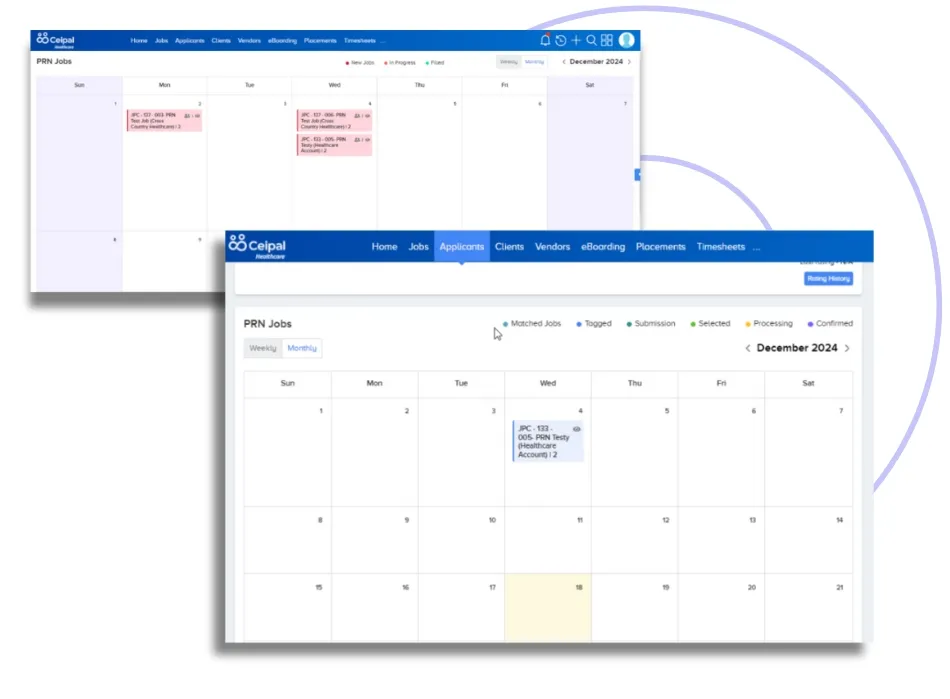 The user-friendly calendar displays reflect job and candidate availability, providing better schedule visibility and management at any time. Each candidate’s calendar clearly reflects all PRN jobs, with easy identification of available or booked slots.