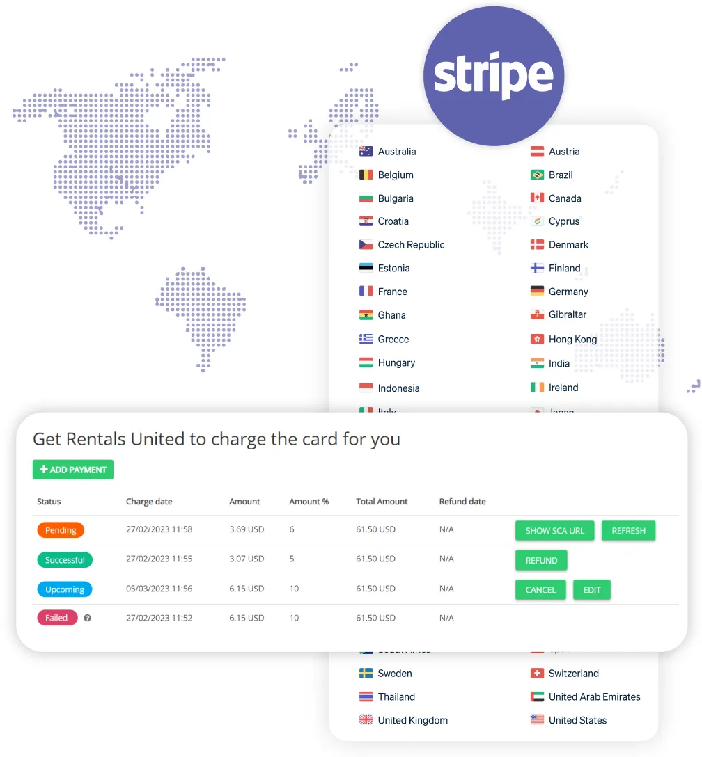 - Stripe Integration: Rentals United integrates with Stripe, a global payment processor supporting over 135 currencies in 47 countries. This enables property managers to handle transactions securely and efficiently as the merchant of record.