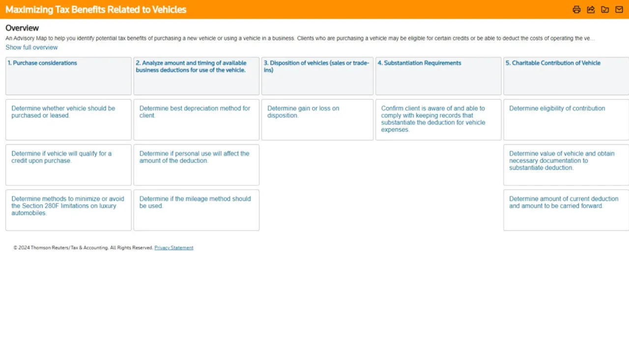 - **Improve tax planning and advisory with Advisory Maps: **Confidently evaluate and determine the best options for your clients with an end-to-end process for delivering specific tax planning and advisory engagements. Named Winner of the 2024 Accounting Today Top New Products, Advisory Maps provides step-by-step guidance and implementation aids for every task and phase of the process.