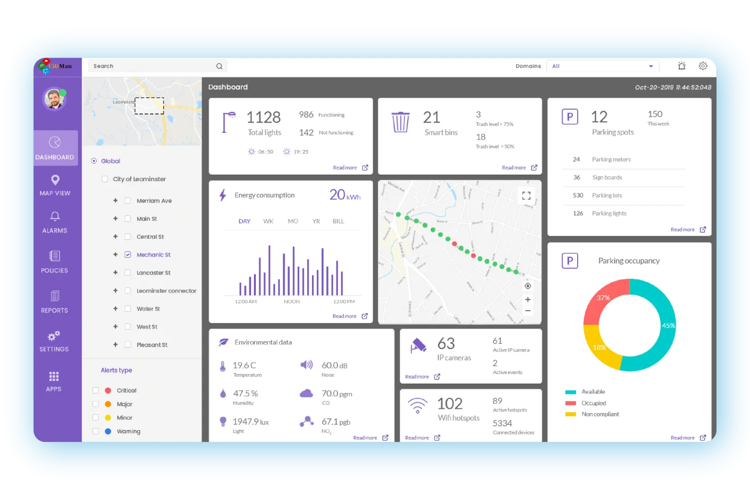 Central management platform for smart city assets, enabling unified monitoring, control, and analytics across lighting, parking, traffic, and more.