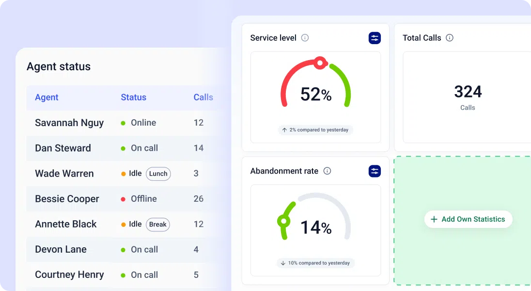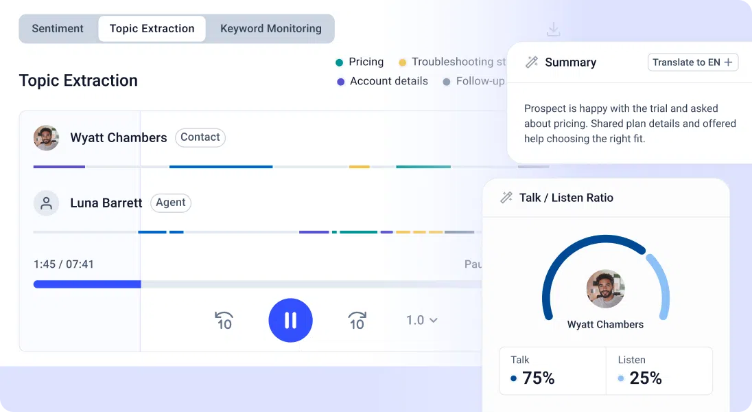 - Advanced Analytics & Coaching: Provides call center analytics, reporting, and live coaching tools to monitor performance, train agents, and improve call outcomes.