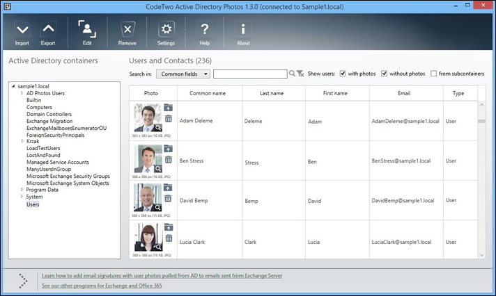 CodeTwo Active Directory Photos is a freeware administrative tool designed to manage user profile photos in on‑premises Active Directory environments. It allows administrators to upload, update, and synchronize user photos in bulk, ensuring consistent images across Active Directory and Exchange-related services. The tool operates locally and provides a simple graphical interface for directory photo management without requiring scripting or manual per-user updates.