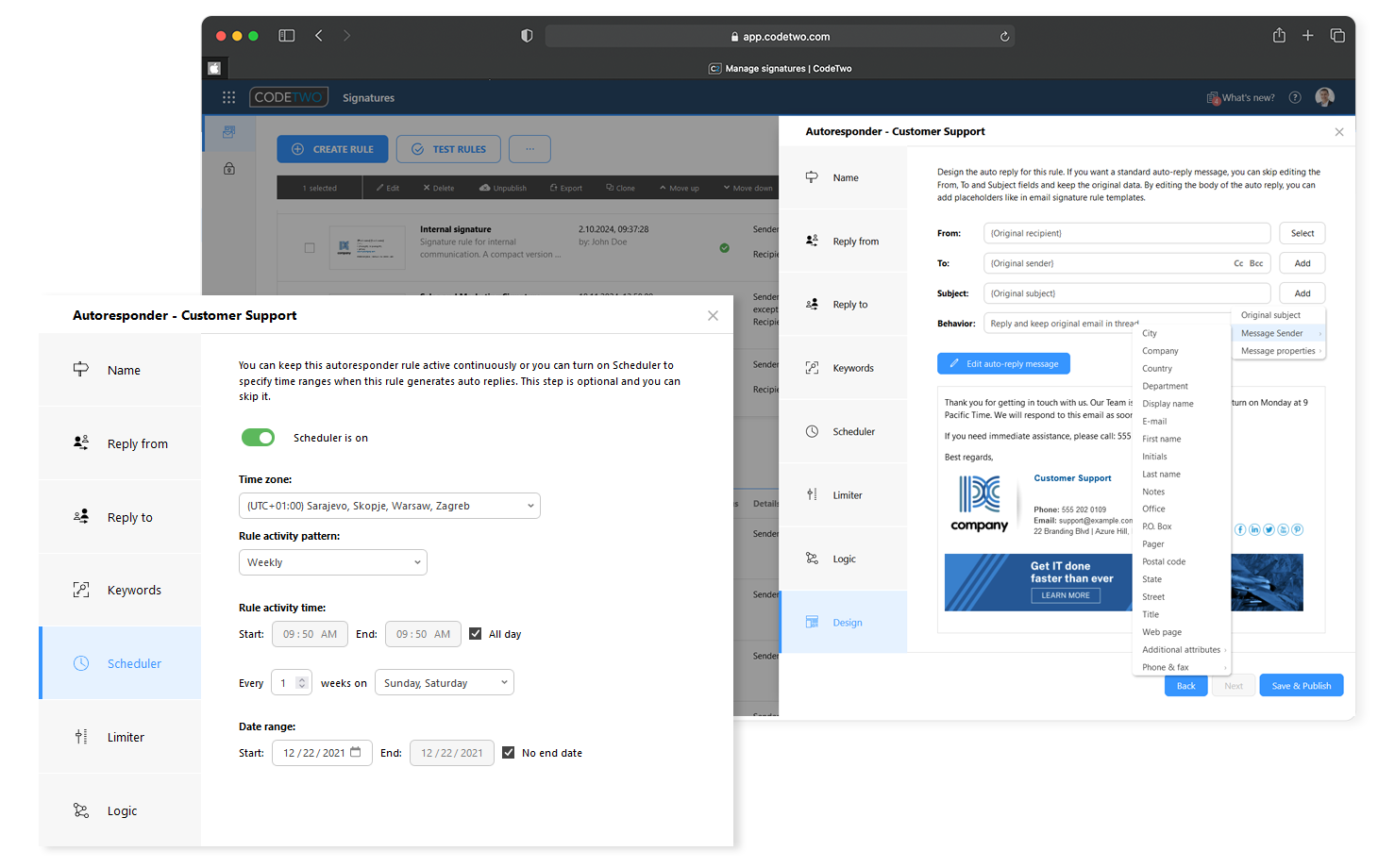 CodeTwo Autoresponder for Microsoft 365 is a server-side email auto-reply management solution designed for organizations using Microsoft 365. It allows administrators to centrally configure and control automatic email responses such as out-of-office replies, absence notifications, and informational messages. Responses are applied at the service level, ensuring consistent behavior without relying on individual user settings or email clients.
