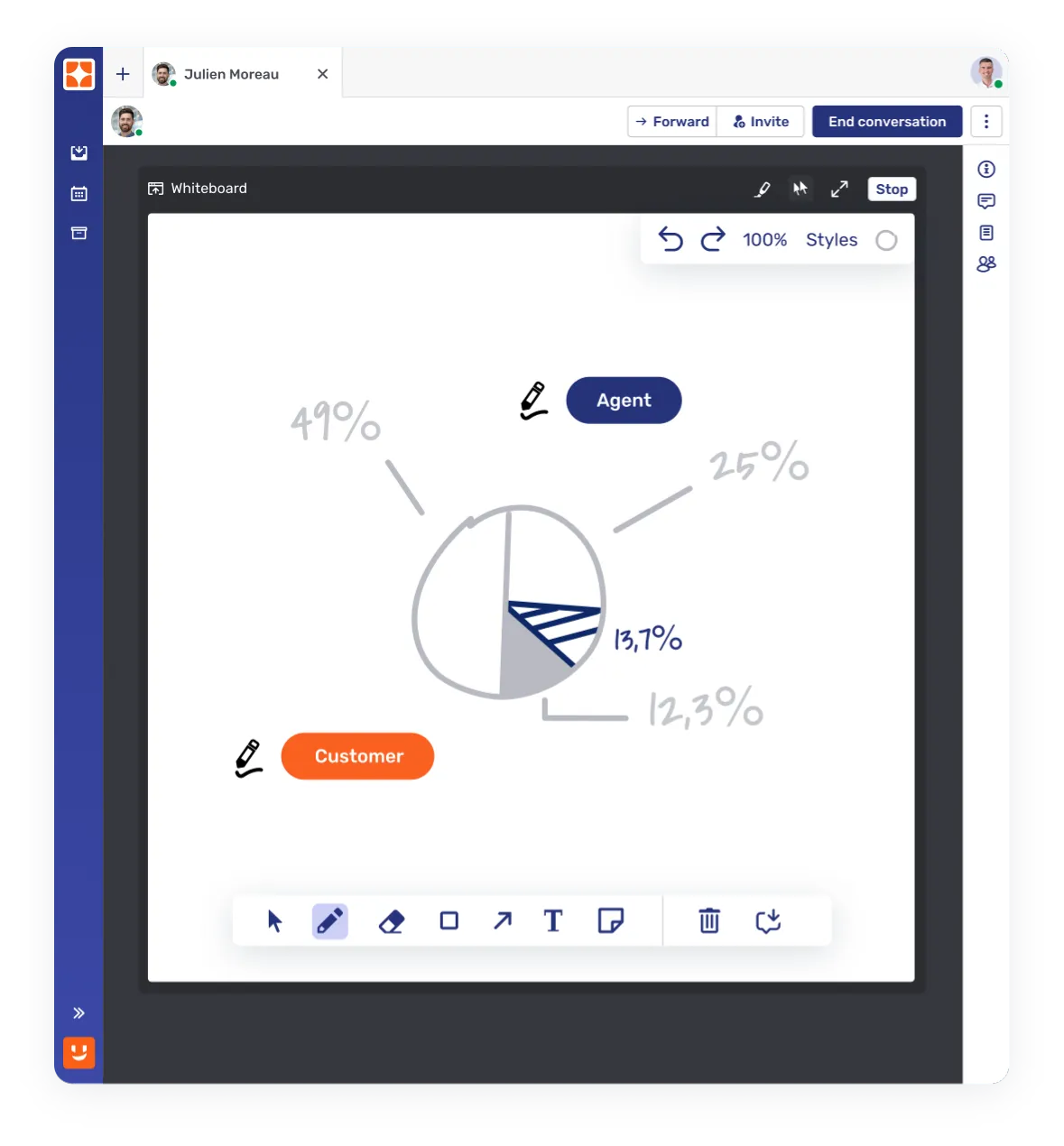 Launch a virtual whiteboard within Live Chat, Video calls, or Co-Browsing sessions.