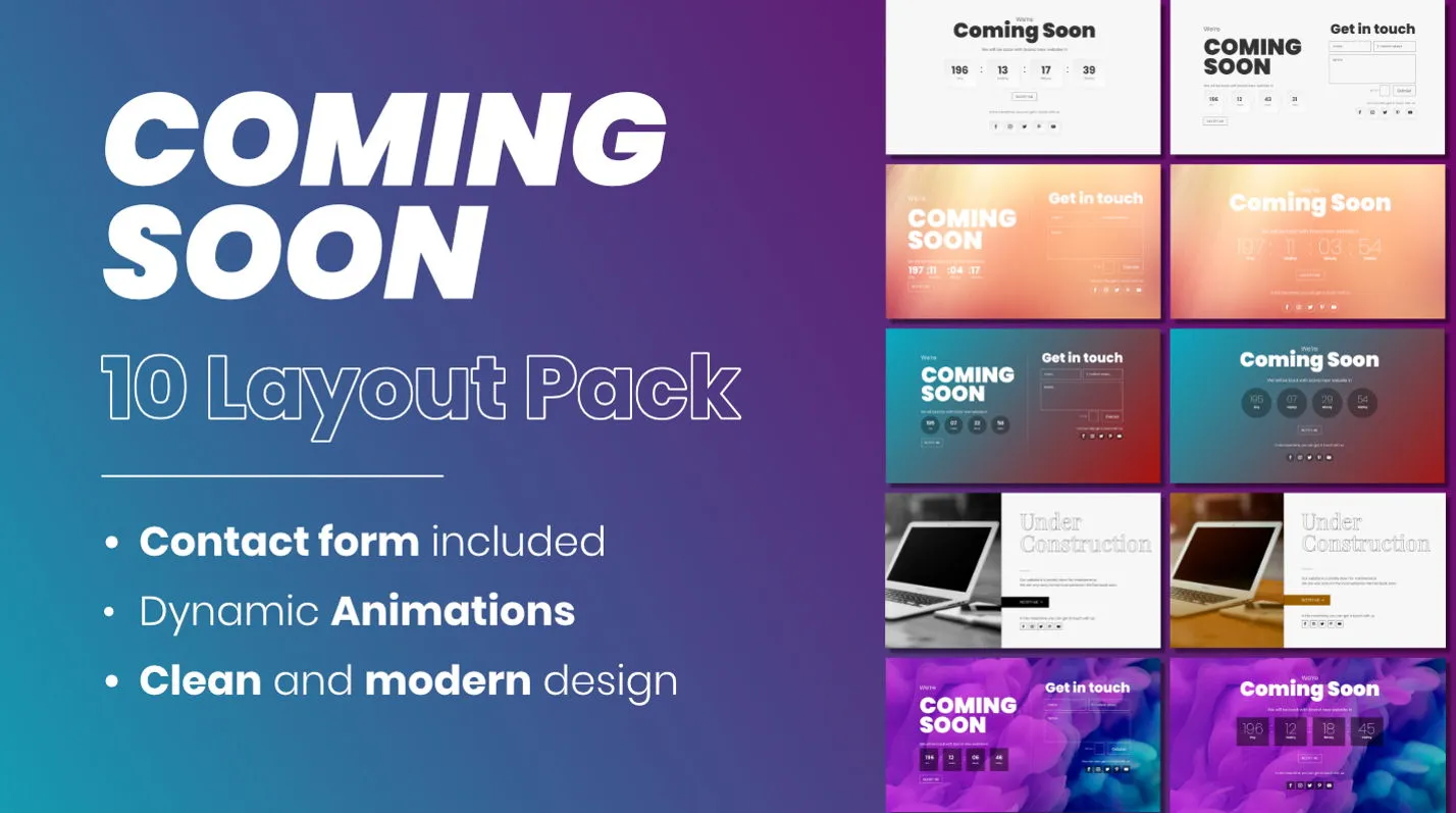 This 10-pack of Divi layouts offers professionally designed coming soon and maintenance pages for websites under construction or updates. Each layout is responsive, customizable, and easy to deploy using the Divi Builder, helping you maintain engagement while your site is offline.