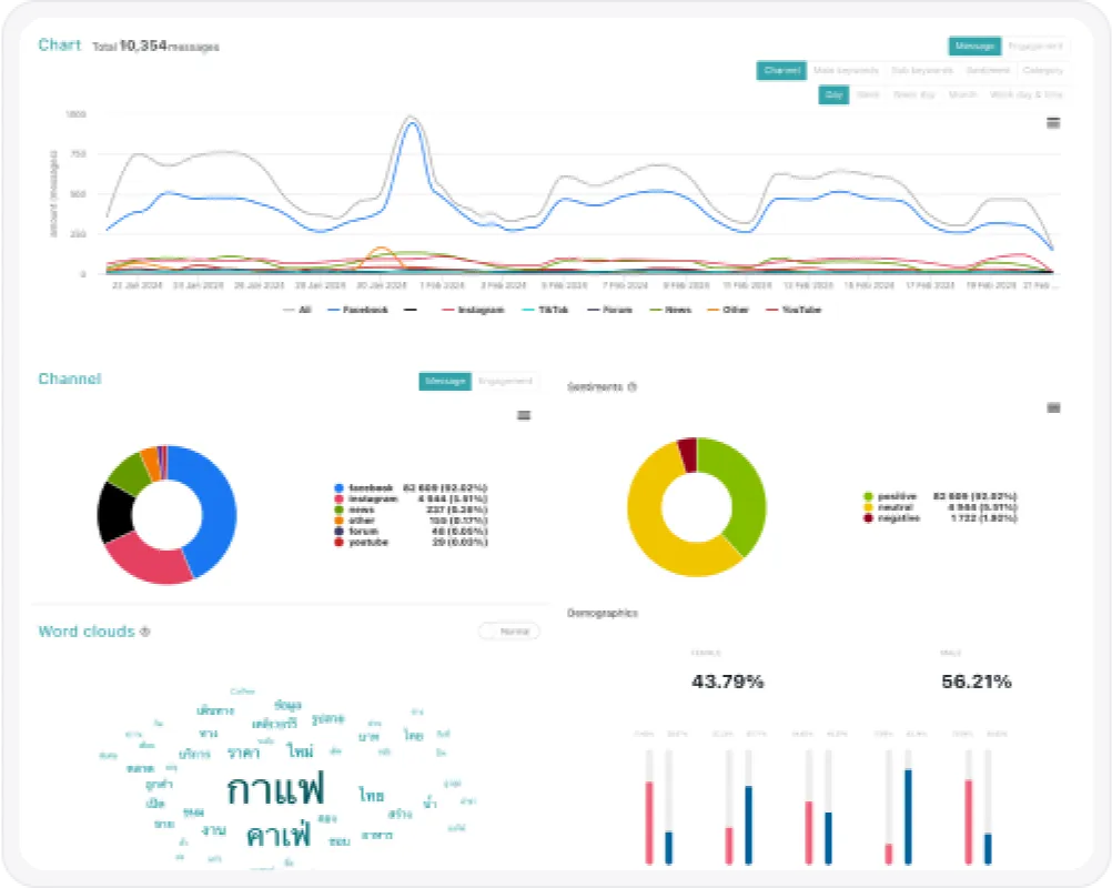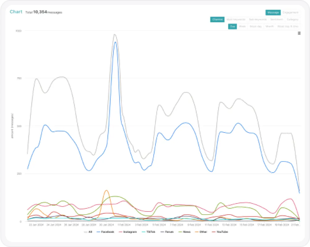 - Allows selection and real-time tracking of social media insights on topics of interest, ensuring consistent data understanding across the organization, with easy automatic on/off management.