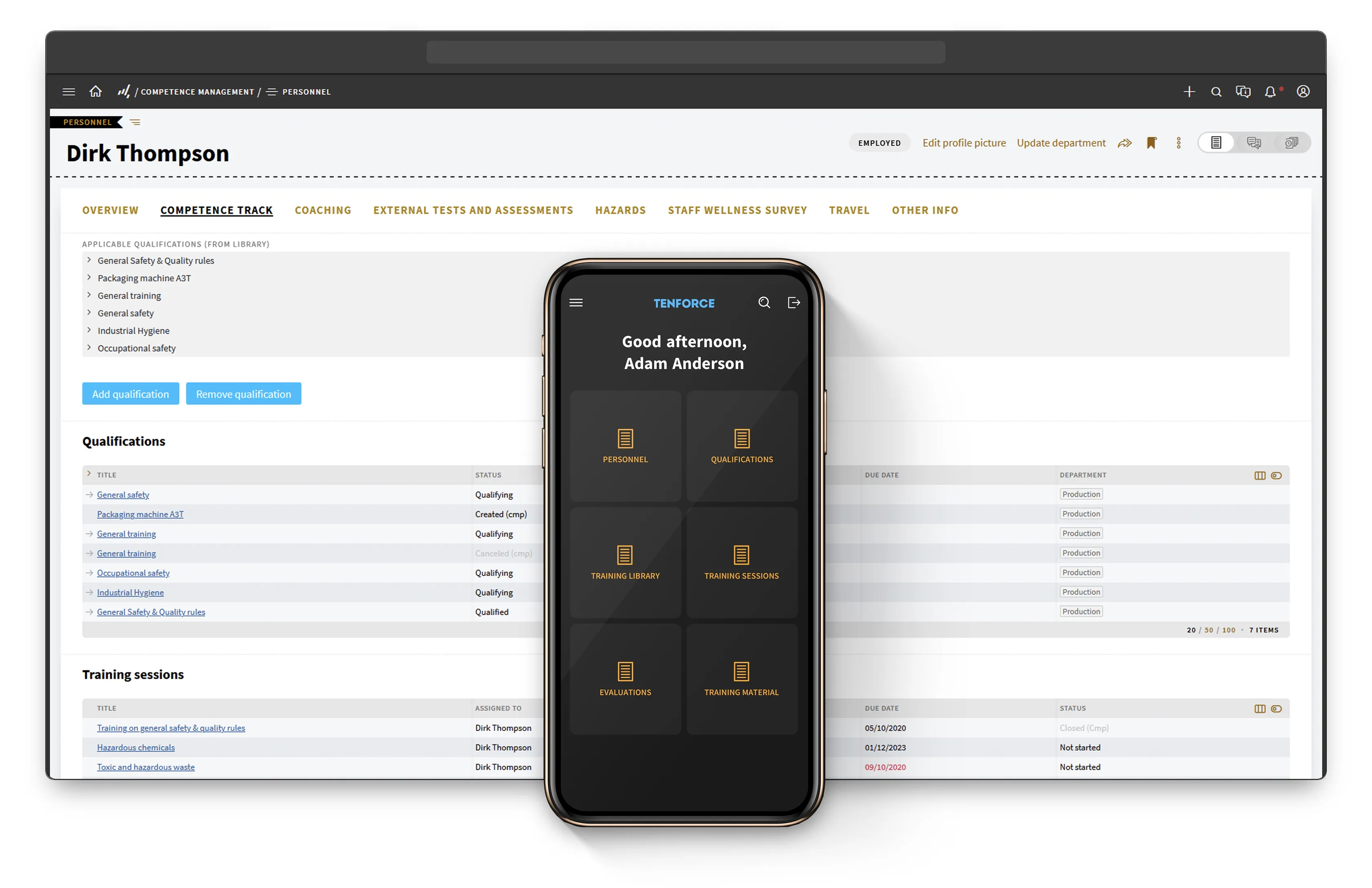 TenForce's Competence Management module enables organizations to create real-time inventories of workforce capability by collecting employee profiles, credentials, and qualifications. It provides a structured approach to Skills Assessment: grouping employees by job titles and locations, setting required qualifications, and automatically identifying gaps to generate targeted training programs with tests and certifications. The Tracking Training Programs capability notifies individuals, links to LMS or documents, and records progress, evaluations, and certification expiries. The Closing the Loop feature automates refresher scheduling, monitors time allocation, and generates compliance-ready reports with data visualization for stakeholders. With integration to CAPA, Risk Management, Audits, and other TenForce modules, it supports continuous improvement, audit readiness, and data-driven resource planning. Real-world results include increases in on-time competence milestones, improved gap closure, and seamless cross-module workflow.