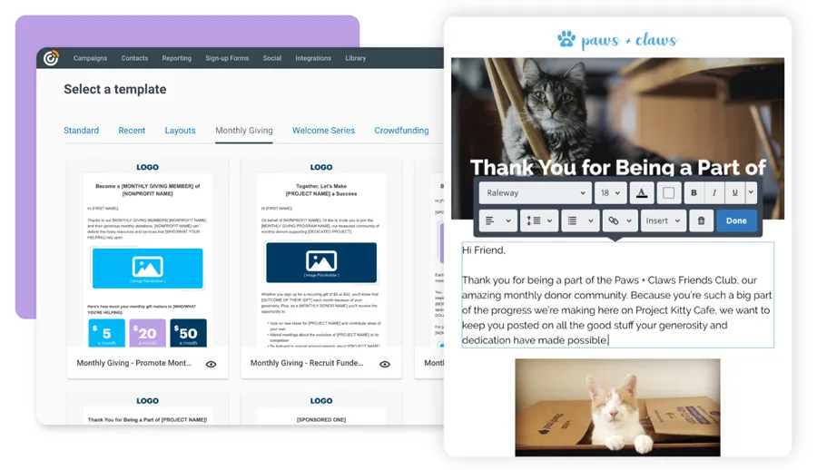 - Drag‑and‑drop email & template editor: Use 30+ (or 100+) customizable fundraising-ready email templates — no coding or design skills needed.