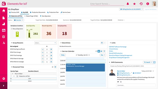 Elements for IoT is a modular software built on the open platform CONTACT Elements. It enables your company to digitalize and automate operational processes in production, the operation of production facilities, and in service. You can flexibly configure functions for key areas such as energy management, asset management, manufacturing (MES/Smart Factory), service, and maintenance, tailored to your digital maturity level.