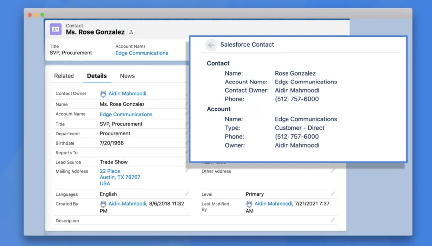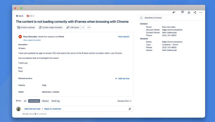 No more context switching. With an automatic match between a Salesforce Contact and a Jira Service Management request reporter, customer information is instantly visible to your customer service team.