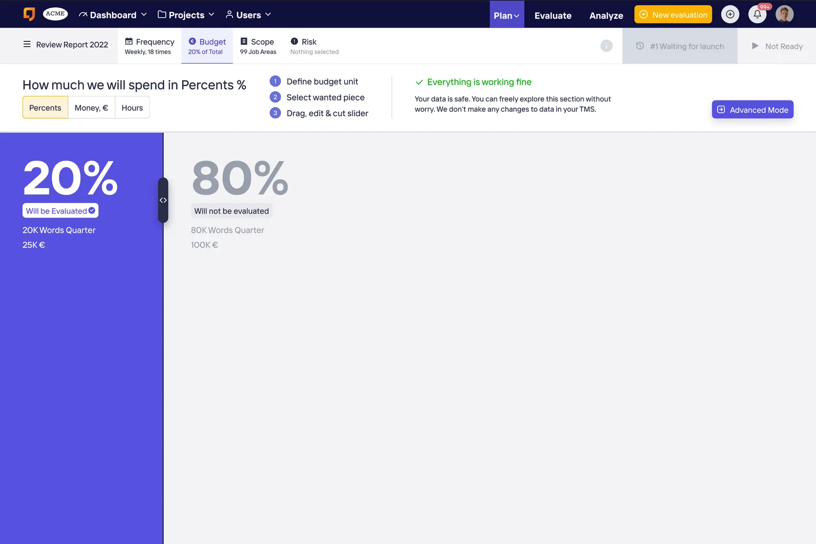 - **Risky translations always go first: **Did this vendor have a bad quality score last month? Does this MT engine require too much post-editing? You define what “risky” means and tailor the risk model to your needs!