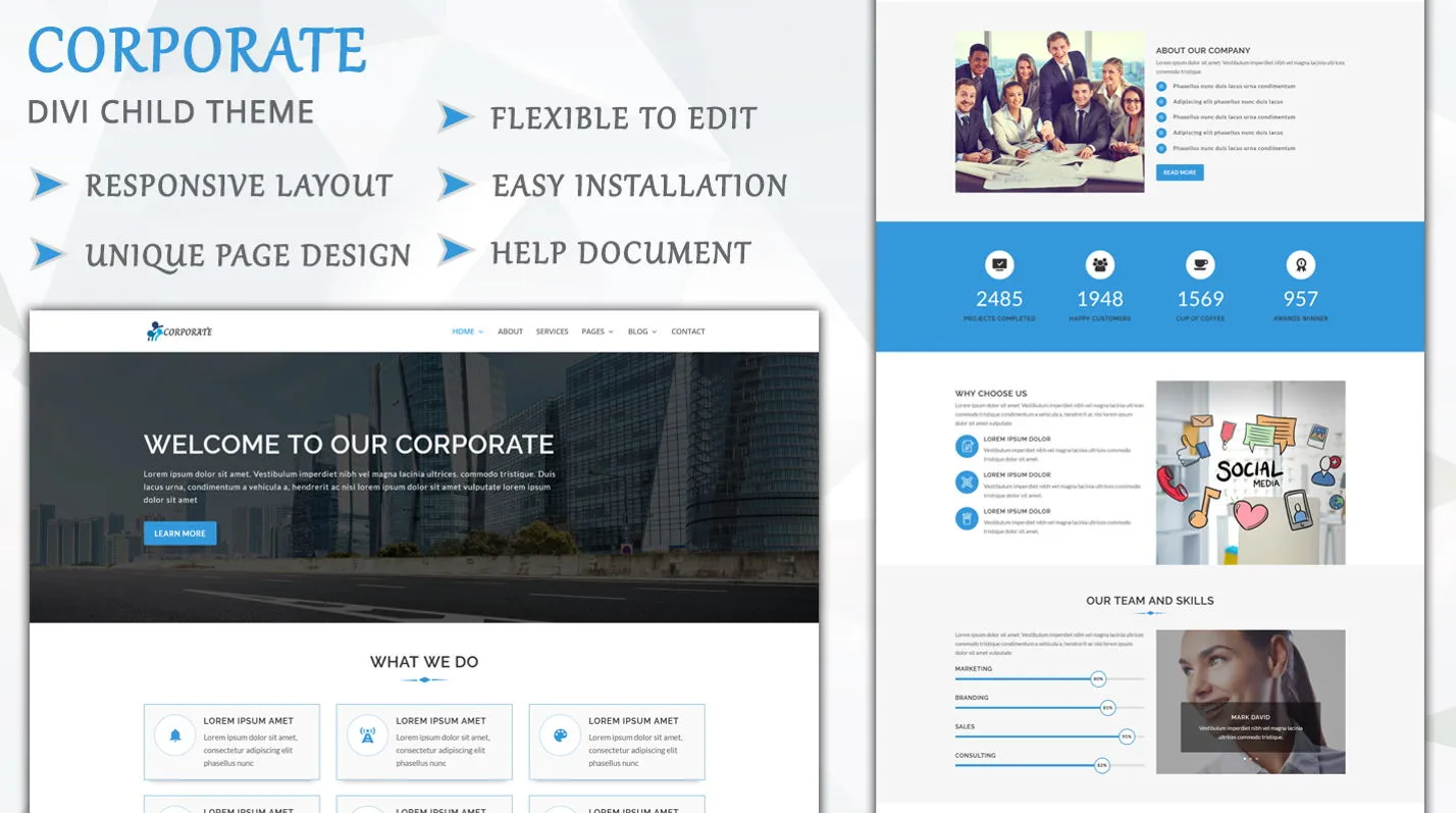 Corporate is modern and elegant Multi Page Divi Child Theme which is suitable for agency, consultancy, marketing company, marketing agency, digital agency, corporate, business, marketing, branding, lead generation, consulting and general categories.