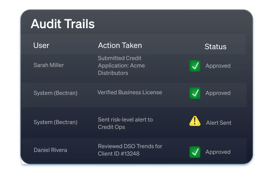 Exception Handling and Collaboration When risk flags arise, your team needs fast, clear direction. Bectran automates exception routing and prioritizes cases by severity, keeping all notes, approvals, and documents in one place. As a result, credit, sales, and leadership can collaborate easily across ERPs and CRMs to resolve issues without losing time or context. Scale Confidently with Built-In Compliance As your portfolio grows, maintaining compliance becomes increasingly complex. Bectran provides review scheduling and documentation to keep you audit-ready, as well as complete visibility into the details and IP address of the entity that provides legal, financial, and Personal Guarantee documents. Customizable rules ensure your process stays aligned with evolving policies and regulatory requirements.