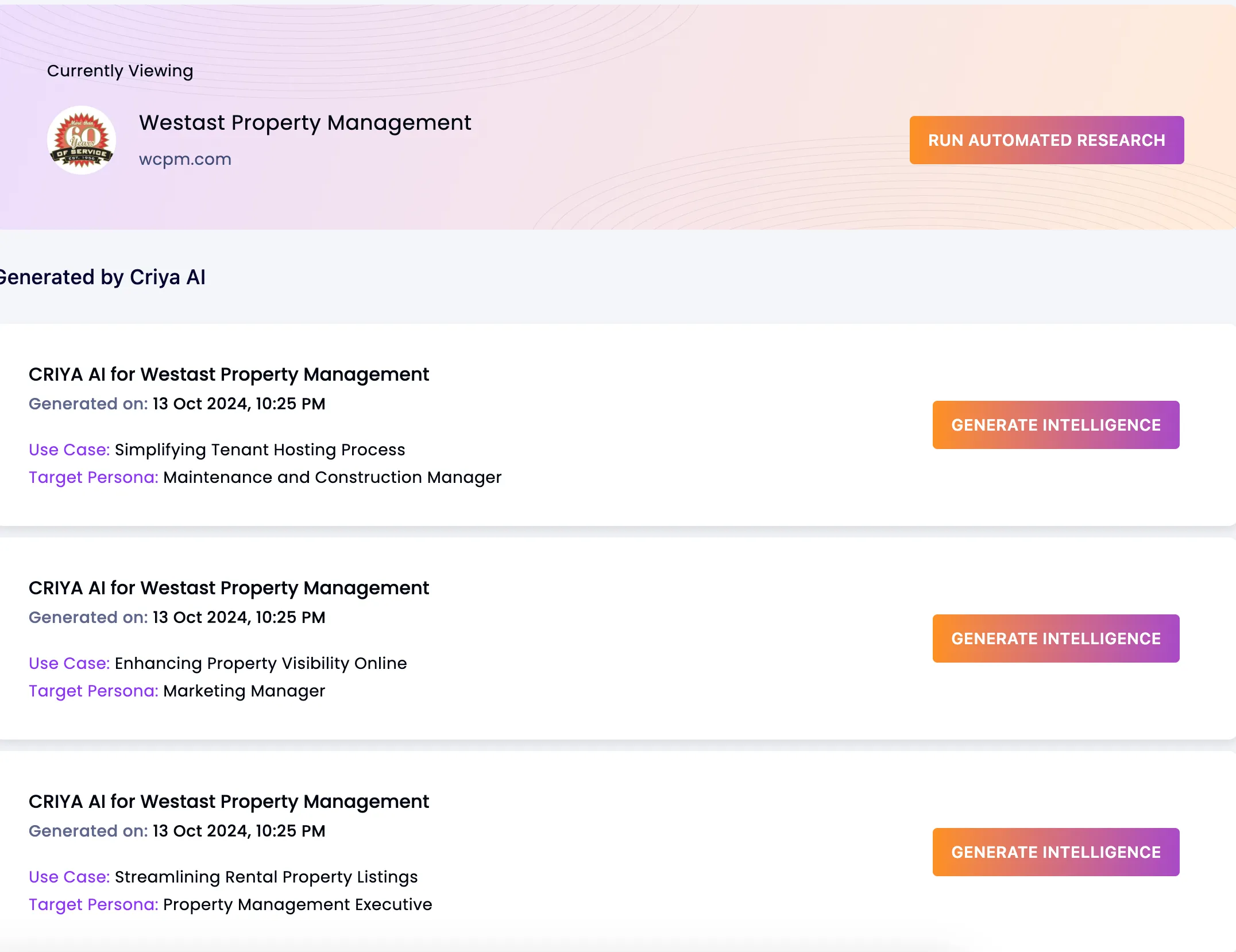 Criya Intelligence Brief streamlines top-of-funnel research by identifying target personas, surfacing relevant use cases, and mapping product capabilities to concrete buyer problems. The module converts these insights into activation-ready assets—hyper-personalized microsites, email sequences, and LinkedIn campaigns—so GTM teams move from research to outreach in seconds. It also crafts urgency messaging anchored in solution benefits and timely triggers, helping prospects understand why to act now. Paired with engagement analytics and CRM sync, teams can track views, session time, and asset hotspots to prioritize follow-up and improve conversion velocity. Designed for startups through enterprises, it compresses manual research cycles and scales consistent, data-backed messaging across accounts and personas. Key Features & Benefits: