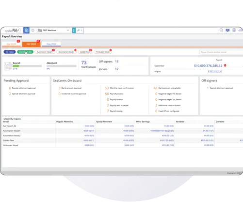 - Comprehensive Payroll Management: Handle onboard and shore payroll seamlessly with support for multinational, multi-currency transactions.