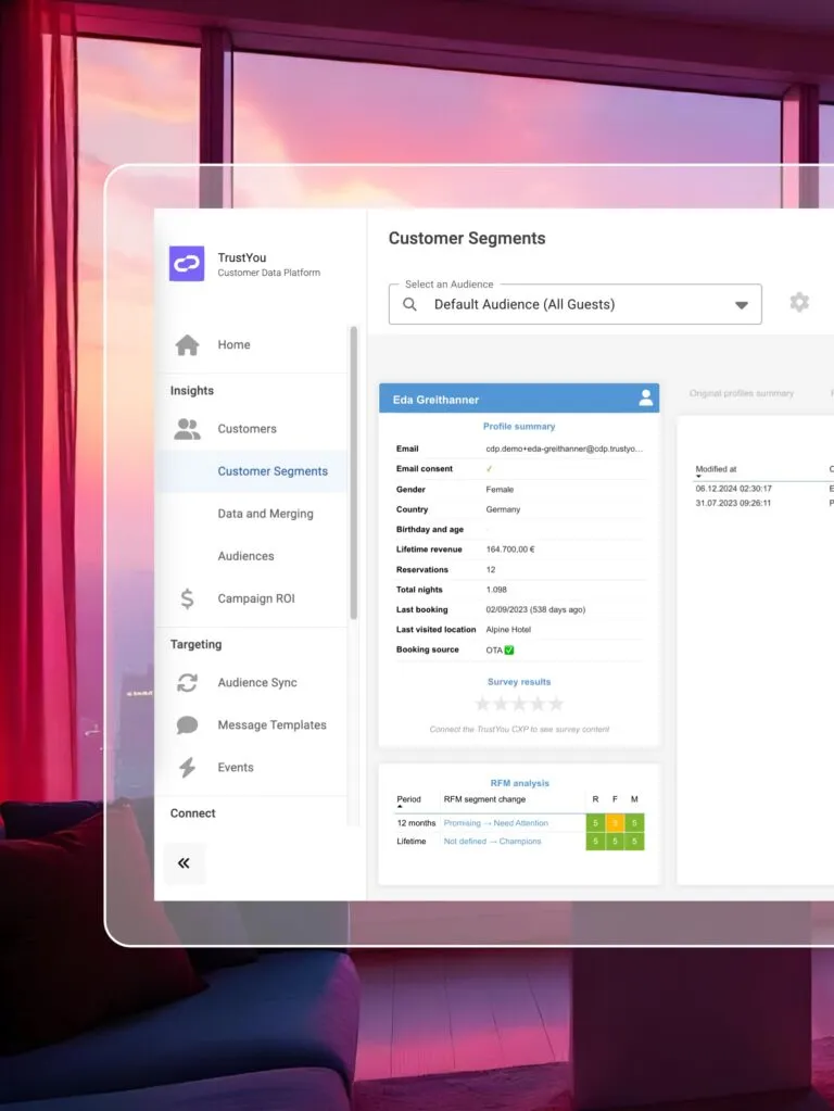 TrustYou’s Customer Data Platform (CDP) is an AI-powered solution designed to unify, manage, and activate guest data across hospitality systems. It consolidates fragmented customer information into a single, actionable profile—known as the “Golden Profile”—to enable personalized communication, targeted marketing, and increased direct bookings. The platform empowers hospitality businesses to make data-driven decisions, improve guest experiences, and maximize customer lifetime value.