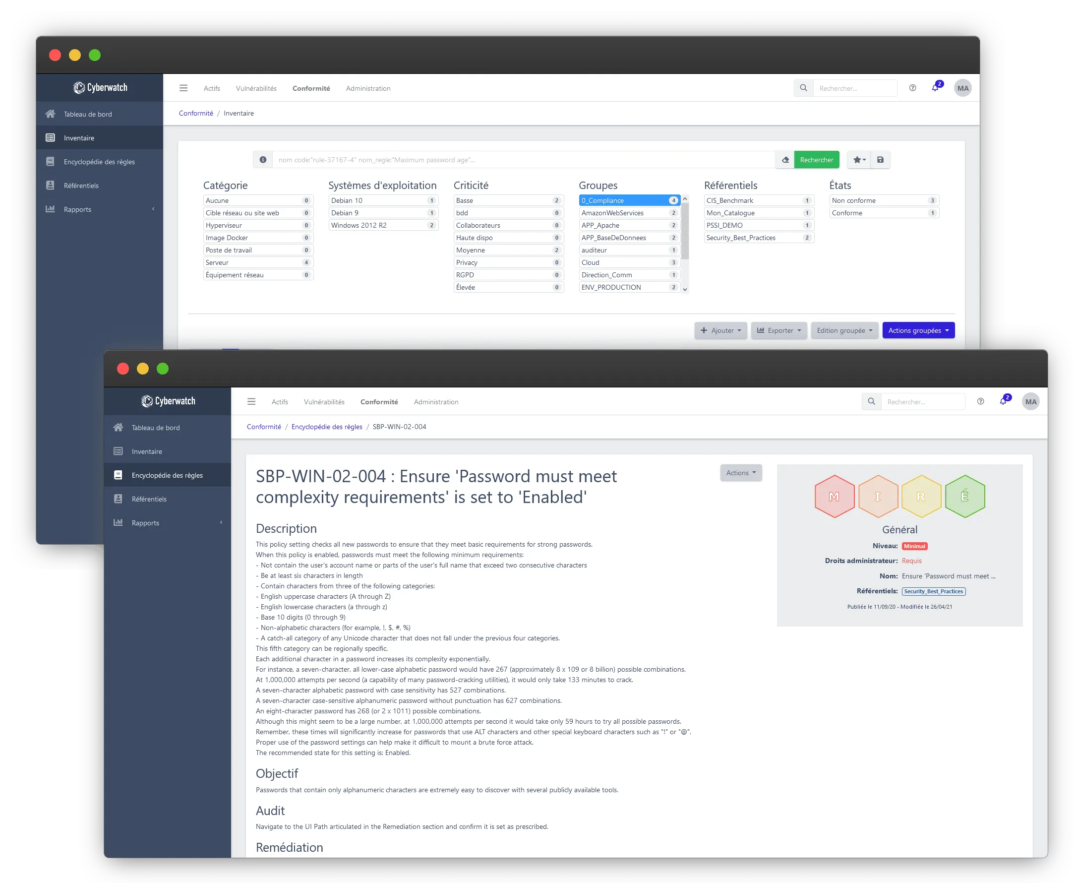 - **Detect: **Continuously check compliance with your standards on your information system, and notify you of non-conformities.