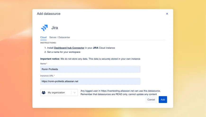 From your main instance, where you previously installed Dashboard Hub, open Dashboard Hub and click on “Add datasource”. Add the URL of the instance where you installed the connector in the previous step.