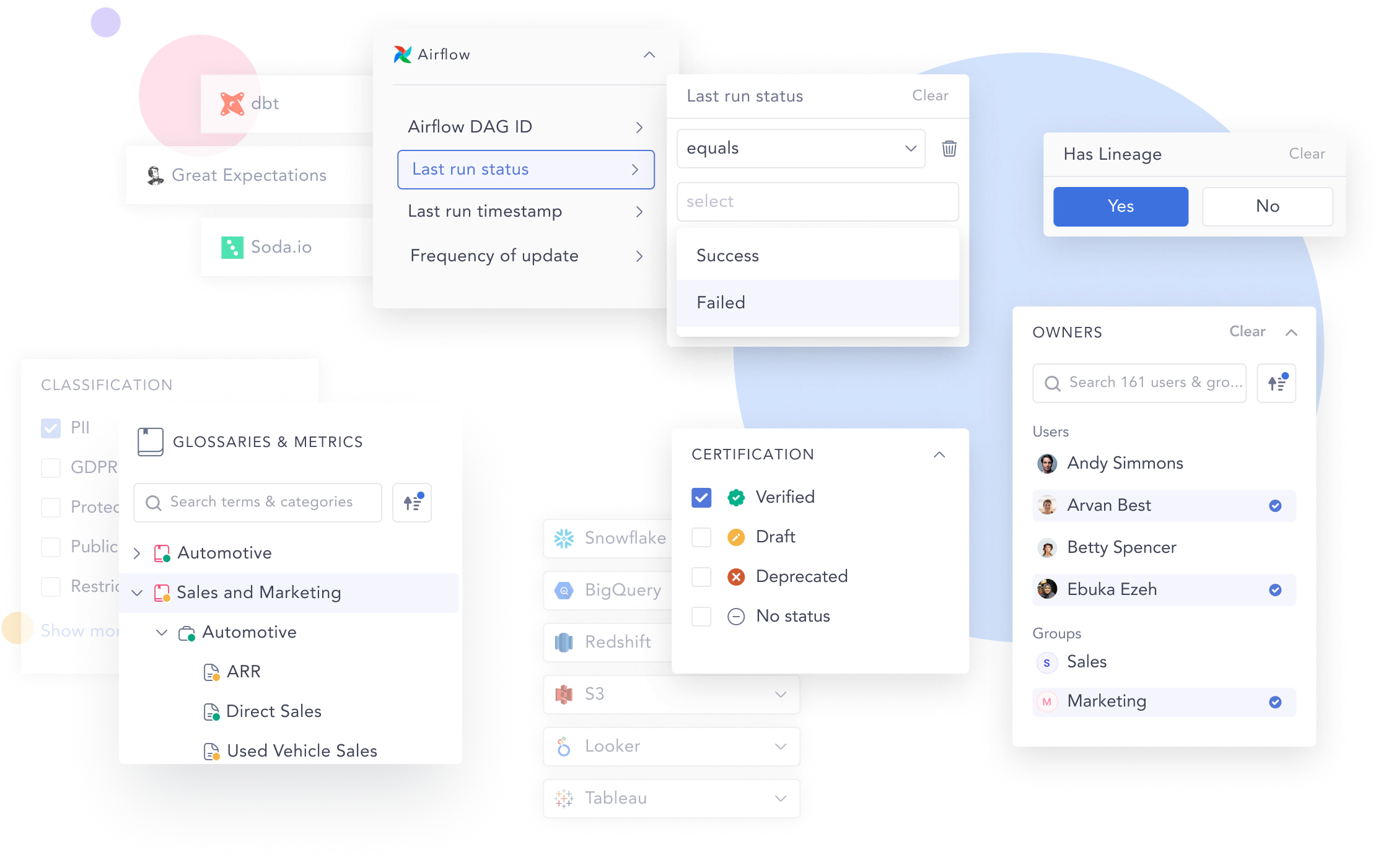 - Rich metadata profiles including schemas, owners, usage, quality, and lineage.