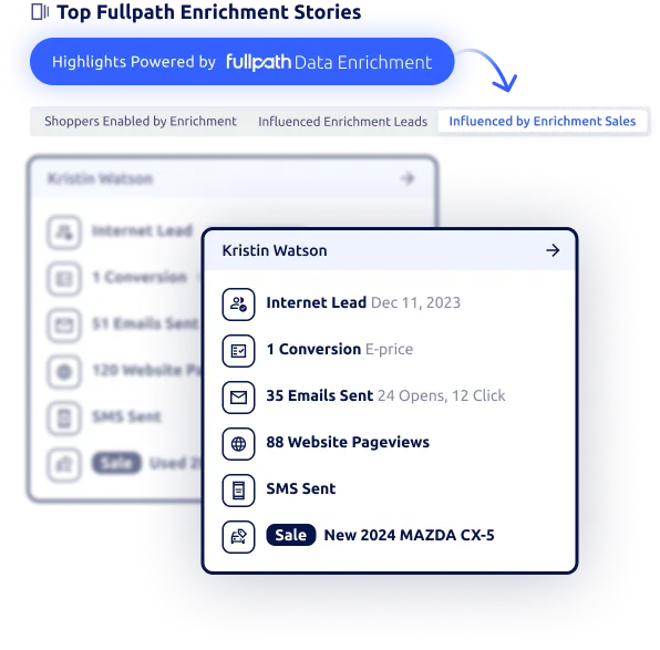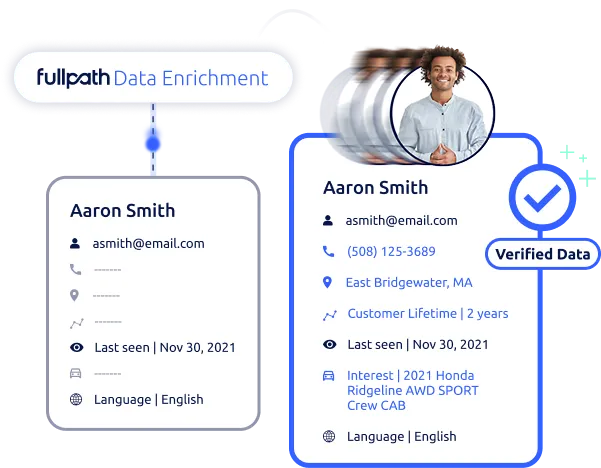 - **Shopper Profile Enrichment: **Fullpath’s Data Enrichment for car dealership's corrects and fills missing phone, email, address, and VIN data to build complete, accurate shopper profiles. Cleaner records enable higher-quality activation and outreach opportunities for marketing and sales teams across the sales funnel.