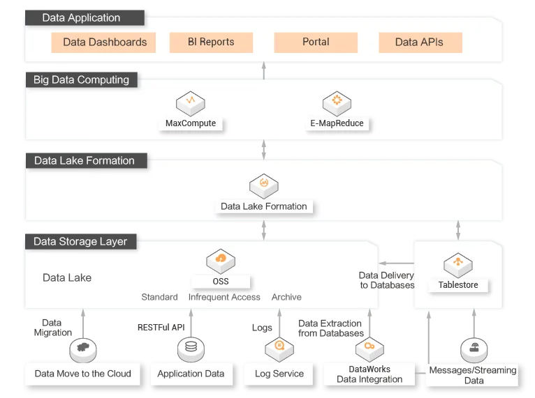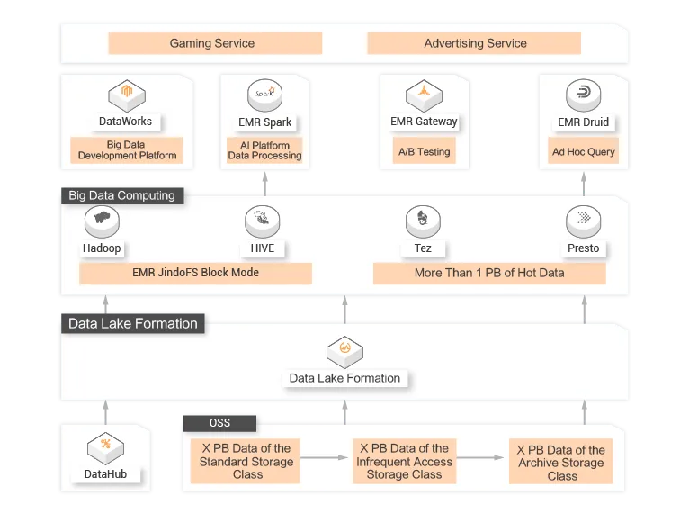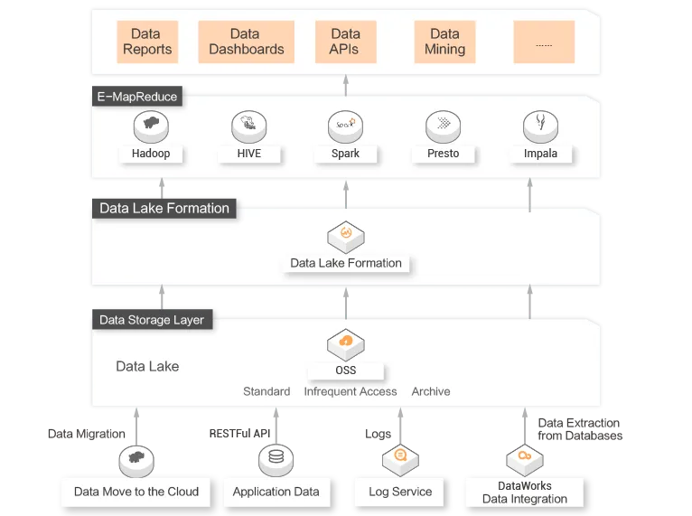 • Easy data collection: systematically collects structured, semi-structured, and unstructured data and supports massive data storage. • Flexible architecture: uses an architecture that separates computing from storage. You can plan resources on demand at low costs. This improves data processing efficiency to meet the rapidly changing business requirements. • Easy data management: uses unified data storage, separately stores cold and hot data, and manages data lifecycle. This solves a variety of O&M issues, such as the failure to copy data across clusters. • Easy value extraction: connects to different types of data computing and analytics platforms. This solves the data silo issues and provides insight into business value.
