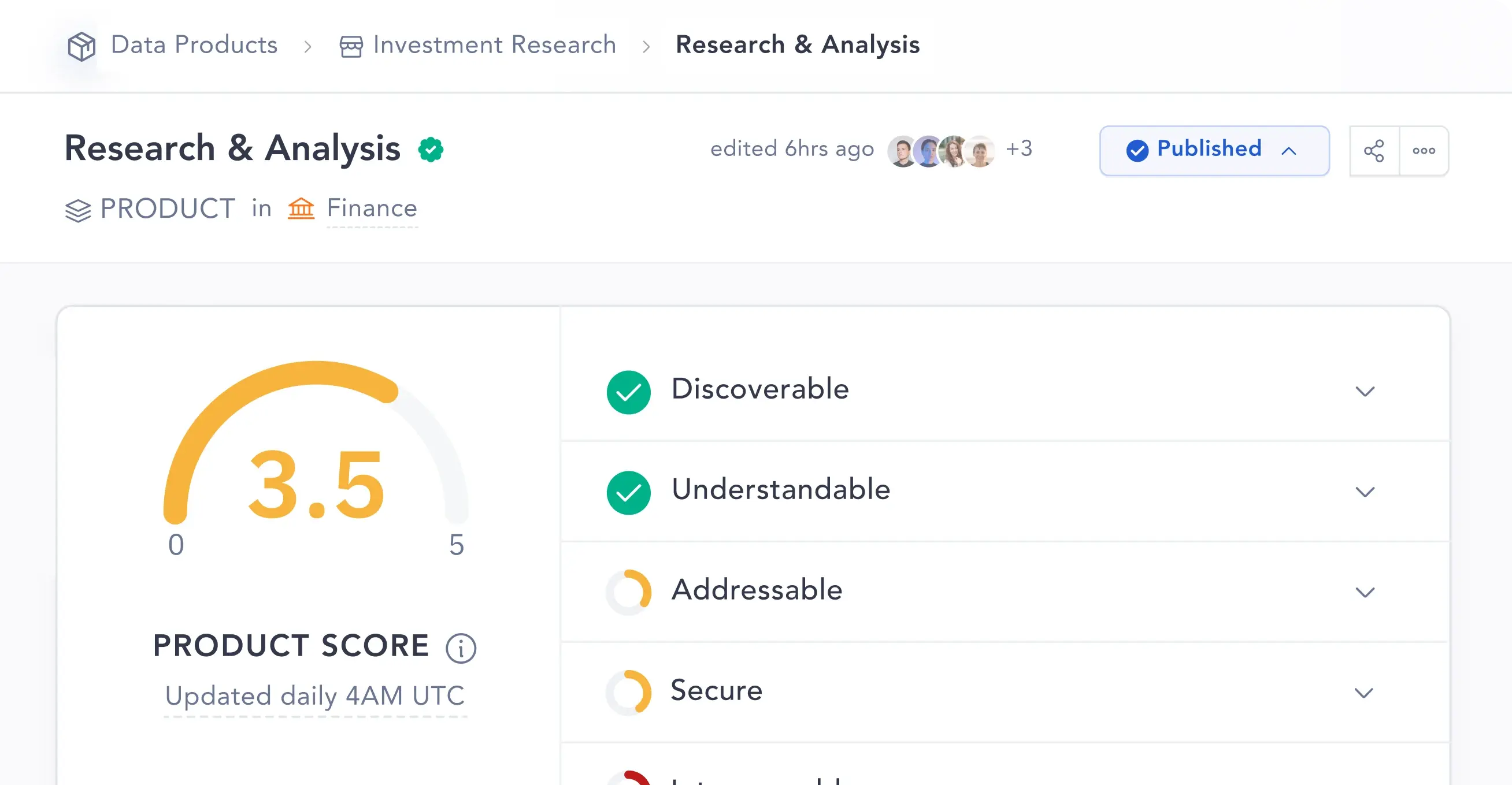 Unified data products marketplace for discoverability, trust, governance, and reuse of business data.