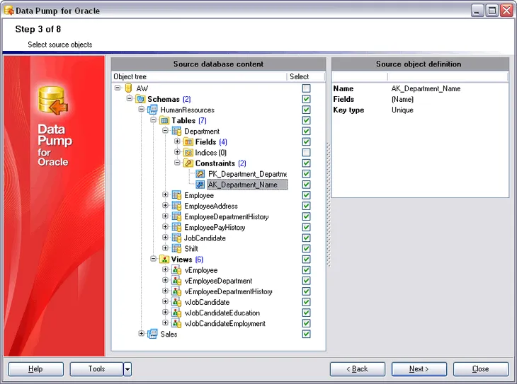 Customizable conversion options Selects specific schemas, tables, fields, and indexes for migration.