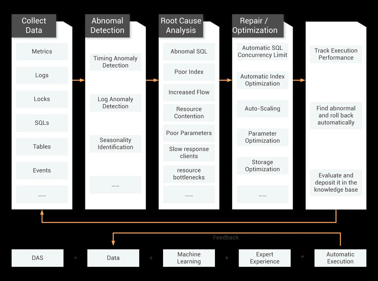 Database Autonomy Service (DAS) is a cloud service that implements self-perception, self-repair, self-optimization, self-O&M, and self-security of databases based on machine learning and expert experience. DAS eliminates the complexity of database management and service failures caused by manual operations, and ensures the stability, security, and efficiency of database services. After six years of exploration, practice, innovation, and accumulation, DAS has made huge breakthroughs since the release of the SQL diagnostic engine in 2014. As of April 2020, DAS has automatically optimized more than 42 million SQL queries, recycled more than 4 PB of space, and optimized 27 TB of memory.