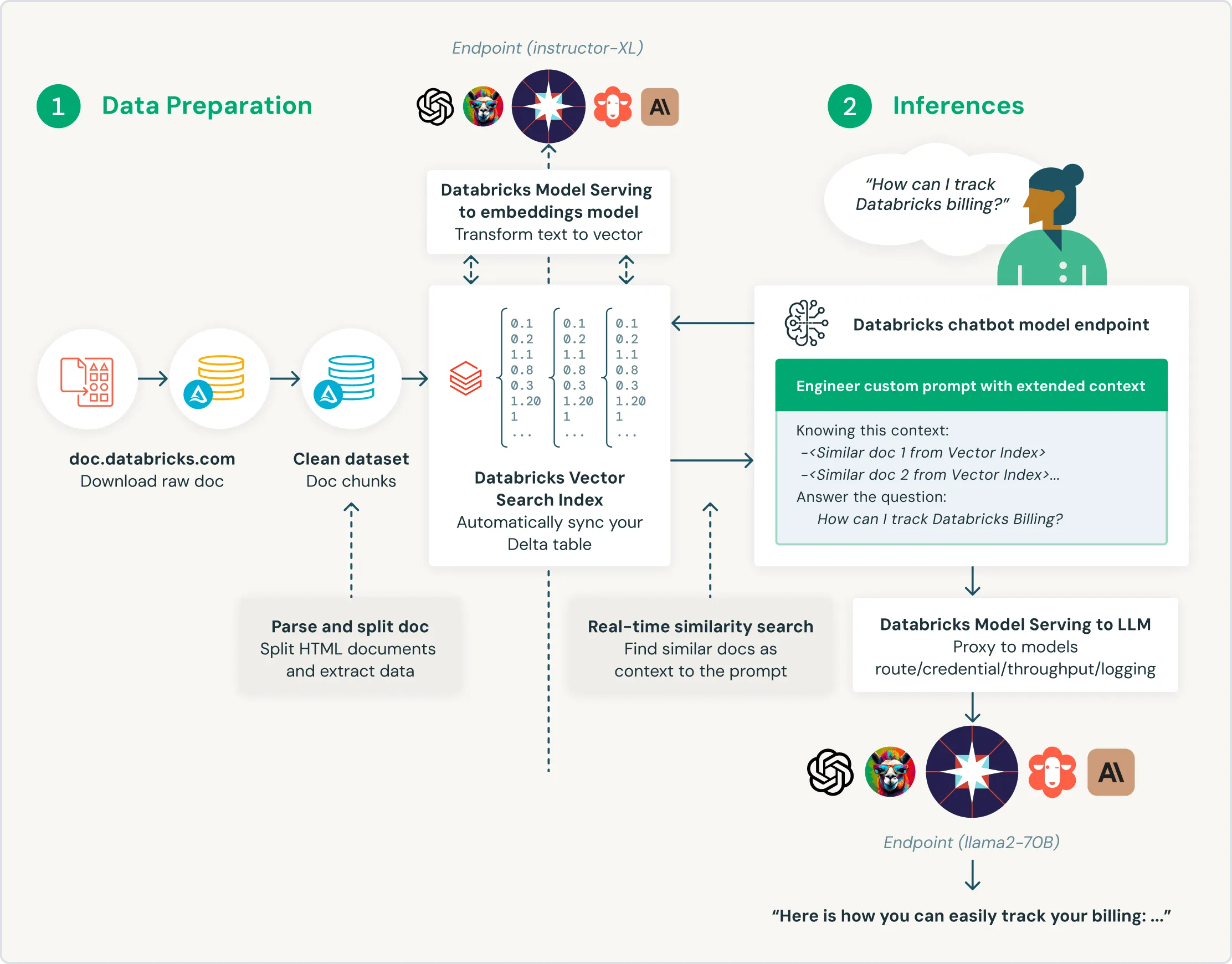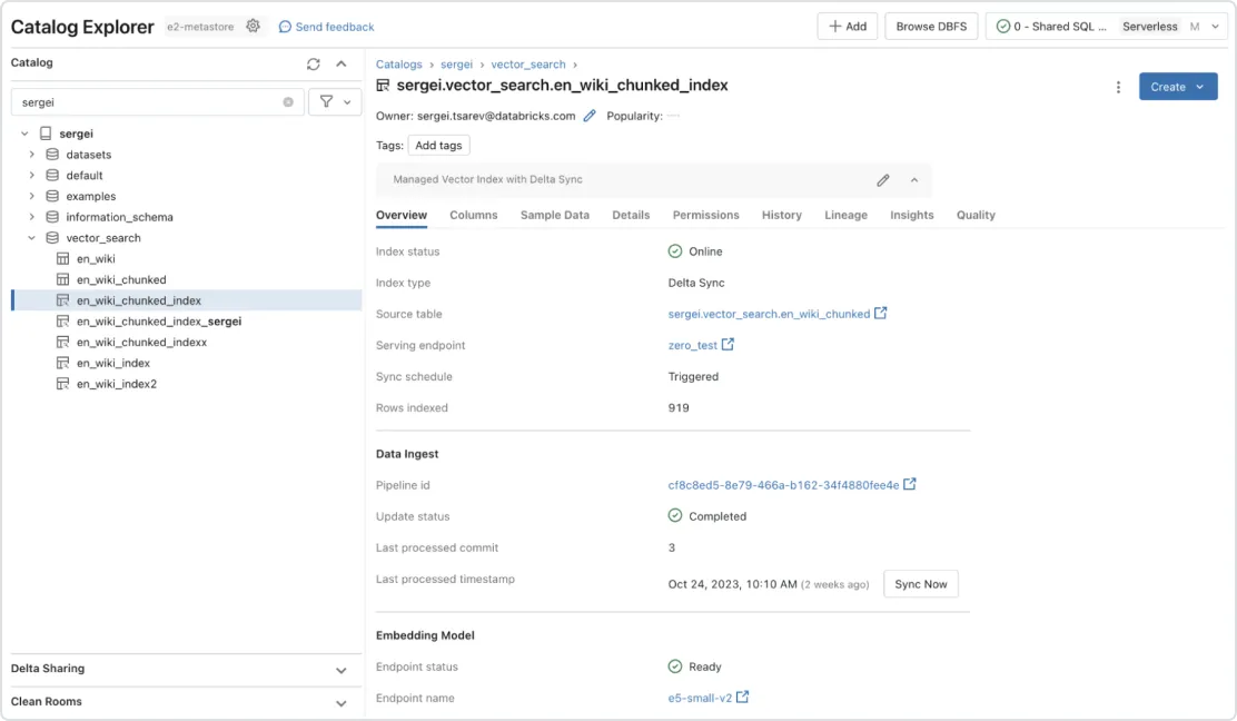 The unified interface defines policies on data, with fine-grained access control on embeddings. With built-in integration to Unity Catalog, Vector Search shows data lineage and tracking automatically without the need for additional tools or security policies. This ensures LLM models won’t expose confidential data to users who shouldn’t have access.