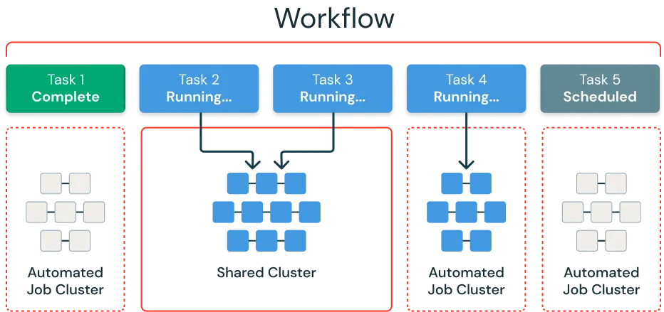 Orchestrating with Databricks Workflows gives you better price/performance for your automated, production workloads. Get significant cost savings when utilizing automated job clusters that have a lower cost and are only running when a job is scheduled so you don’t pay for unused resources. In addition, shared job clusters let you reuse compute resources for multiple tasks so you can optimize resource utilization.