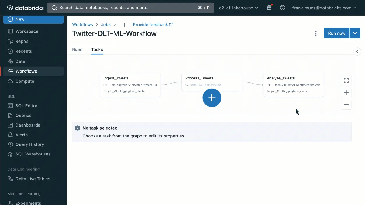 Define workflows in your preferred environment — easily create workflows right in the Databricks workspace UI or using your favorite IDE. Define tasks that use a version-controlled notebook in a Databricks Repo or in a remote Git repository and adhere to DevOps best practices such as CI/CD.