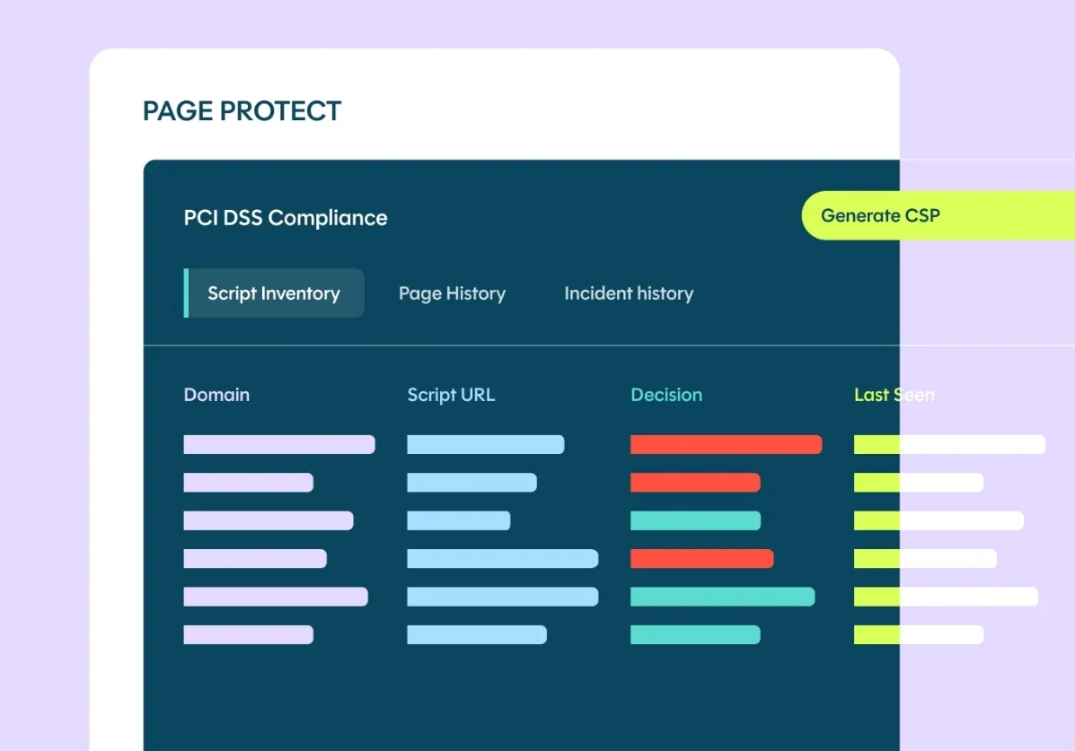 - Client-Side Script Inventory & Monitoring: Page Protect delivers turnkey visibility into all client-side scripts, including automatic discovery, documentation, and continuous monitoring of script activity.